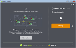 On this Windows 7 laptop, it was stuck on "Starting" because Windows opened a box asking me to confirm I wanted Etcher to erase the USB drive, the problem was, this popped up BEHIND the Etcher window. It was flashing down in the taskbar. If this happens to you, just click the flashing window and click OK. Mac and Linux desktops also ask for confirmation. Depending on your version, you may be asked for an admin password.